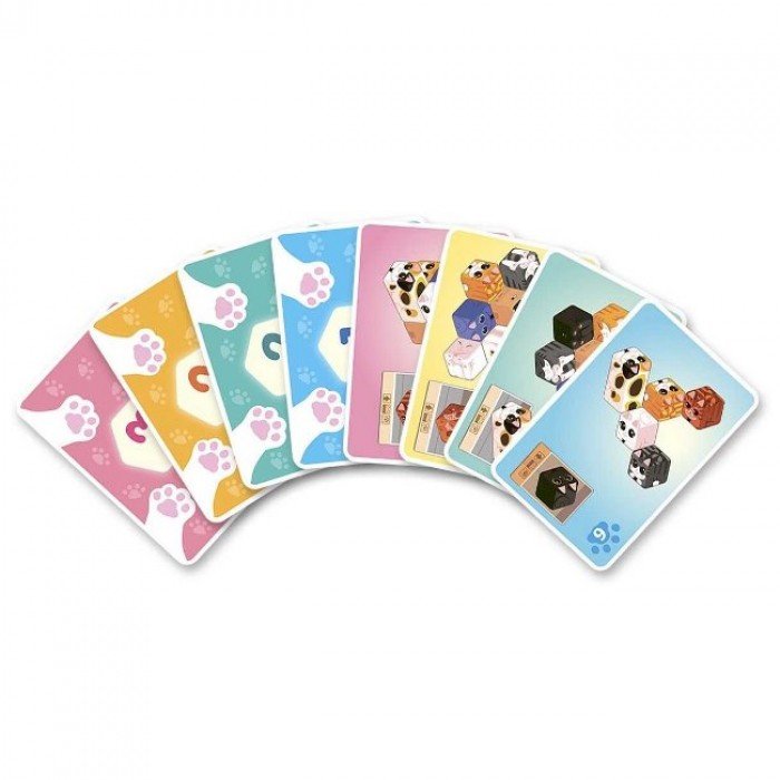 В игре «Кошачья лапка (Kitty Paw)» есть карточки с заданиями, тайлы с гексообразными разноцветными котиками (принявшими форму коробки) и карты коробок. Задача игрока - взять себе задание, на котором изображены кубические коты в определенном порядке, и разместить перед собой тайлы таким же образом. Кажется, это просто. Но загвоздка в том, что коробочные котята лежат на столе кучей, брать можно только по одному тайлу, при этом другие игроки делают то же самое. Так ещё и собрать своё задание нужно быстрее соперников, а потом - мяукнуть. К тому же кубическая форма милашных созданий вводит в заблуждение и ещё больше тренирует мышление. А на третьем уровне сложности даже в одиночку справиться с кошачьим ребусом не так-то легко. Поэтому в том, что играть в «Кошачью лапку» безумно увлекательно - сомнений быть не может. Осталось понять, как остановиться.