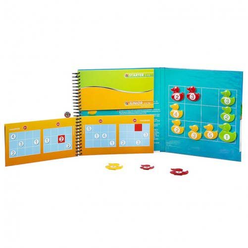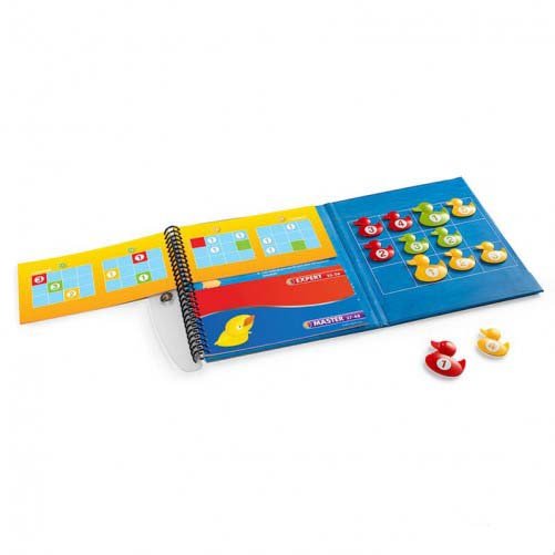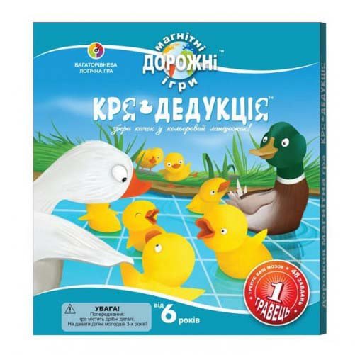 Если бы Конан Дойл писал не о Шерлоке Холмсе, а о Скрудже Макдаке, то тот бы вовсю применял кря-дедукцию, раскрывая загадочные преступления. В оригинальной магнитной игре-головоломке «Кря-дедукція» от Smart Games юным игрокам также предстоит использовать свою логику и сообразительность, но не для борьбы с преступностью, а для не менее важного дела — помощи маленьким утятам. Основная задача в этой увлекательной развивающей игре — разместить на клетках магнитного поля в виде озера три пернатых семейства (5 жёлтых, 4 красных и 3 зелёных уточки) таким образом, чтобы ни один утёнок не отстал от своей мамы. Все обитатели картонного водоёма пронумерованы и должны следовать друг за другом по вертикали или горизонтали, а в игре приведено 48 заданий разной сложности, которые показывают, где изначально располагается несколько утят — остальных предстоит расставить игрокам (почти как в «судоку»). Причём правильное решение в каждом задании только одно, а на уровне «Мастер» даже взрослым придётся задуматься. Переходя от простых заданий к более сложным, дошкольники и младшие школьники не только смогут развить своё логическое мышление, но и увлечься не на шутку. Хорошо, что с компактной игрой «Кря-дедукція» можно практически не расставаться: она сделана в виде книги с полем и заданиями, а с уточками на магнитах удобно играть в поезде, машине или автобусе. С такими играми-головоломками не страшна даже самая дальняя дорога!