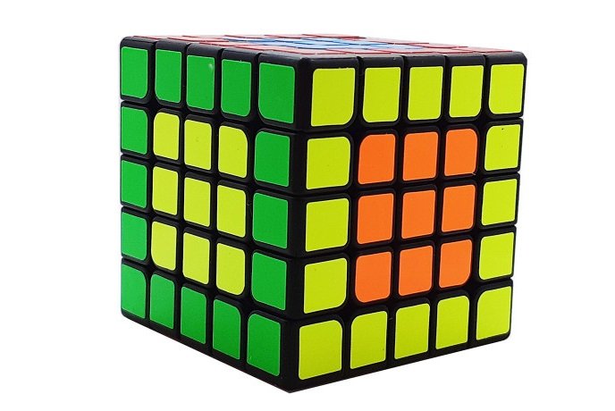 Кубик 5x5 из черного пластика с цветными наклейками размером 62х62х62 мм