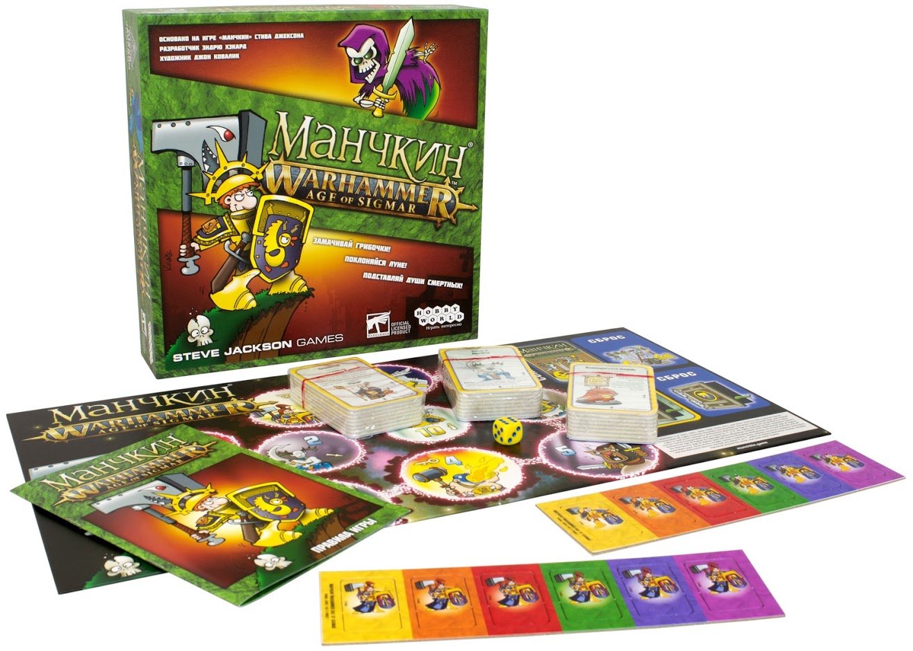 Владения Смертных ждут вас. Там тоже есть монстры, которых нужно мочить, и сокровища, которые можно хапать. И как вы можете догадаться, манчкины не преминули этим воспользоваться. В новой полностью самостоятельной игре «Манчкин Warhammer: Age of Sigmar» легендарная пародия РПГ и известный настольный варгейм «Вархаммер Эра Сигмара» объединились в одной коробке! И в этом тематическом выпуске вас ждет ядерное сочетание эпического фэнтези и неповторимого юмора в стиле «Манчкина».
