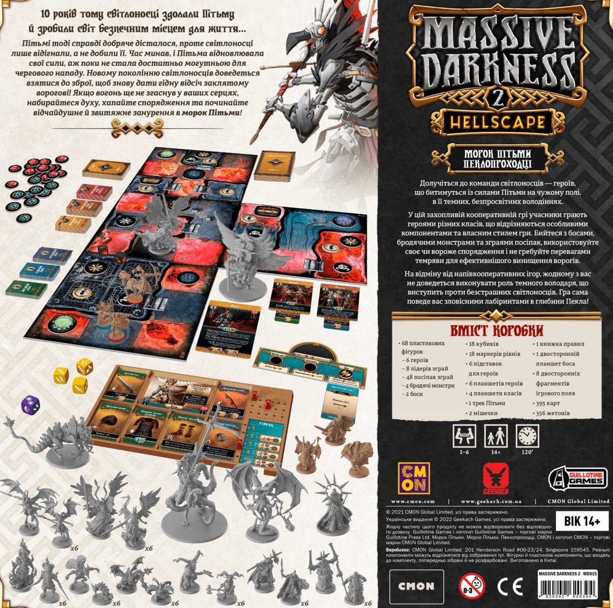 Неважно, играли ли вы в знаменитый данжен кроулер «Massive Darkness (Кромешная тьма)» или нет. Свежайшая новинка 2022 года «Морок Пітьми. Пеклопроходці (Massive Darkness 2: Hellscape UA)» порадует вас не только доработанными правилами и обновленными механиками, но и украинской локализацией этого потрясающего РПГ. И конечно же, в полностью самостоятельном продолжении не обошлось без высокодетализированных миниатюр (в количестве 68 штук!) и приятных нововведений в оформлении, от которых захватывает дух.