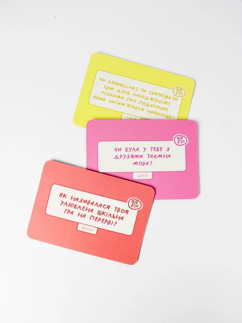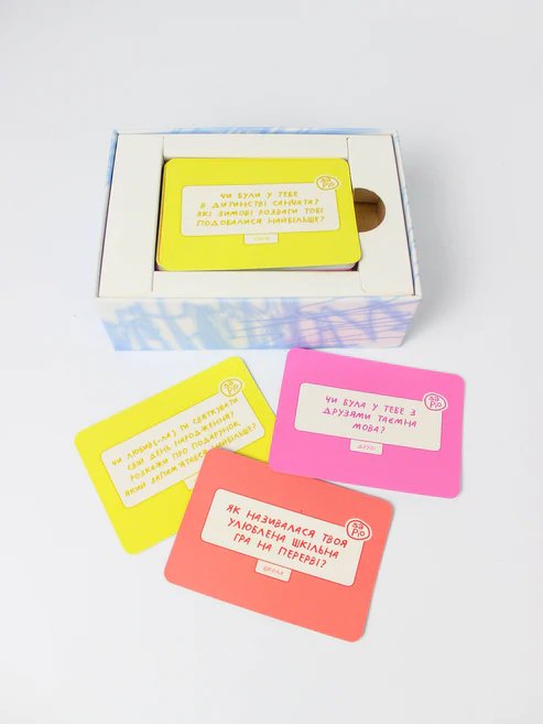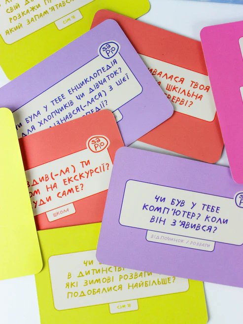 7 рубрик: школа, двор, лагерь, друзья, дом, семья, развлечения и отдых;84 карты вопросов