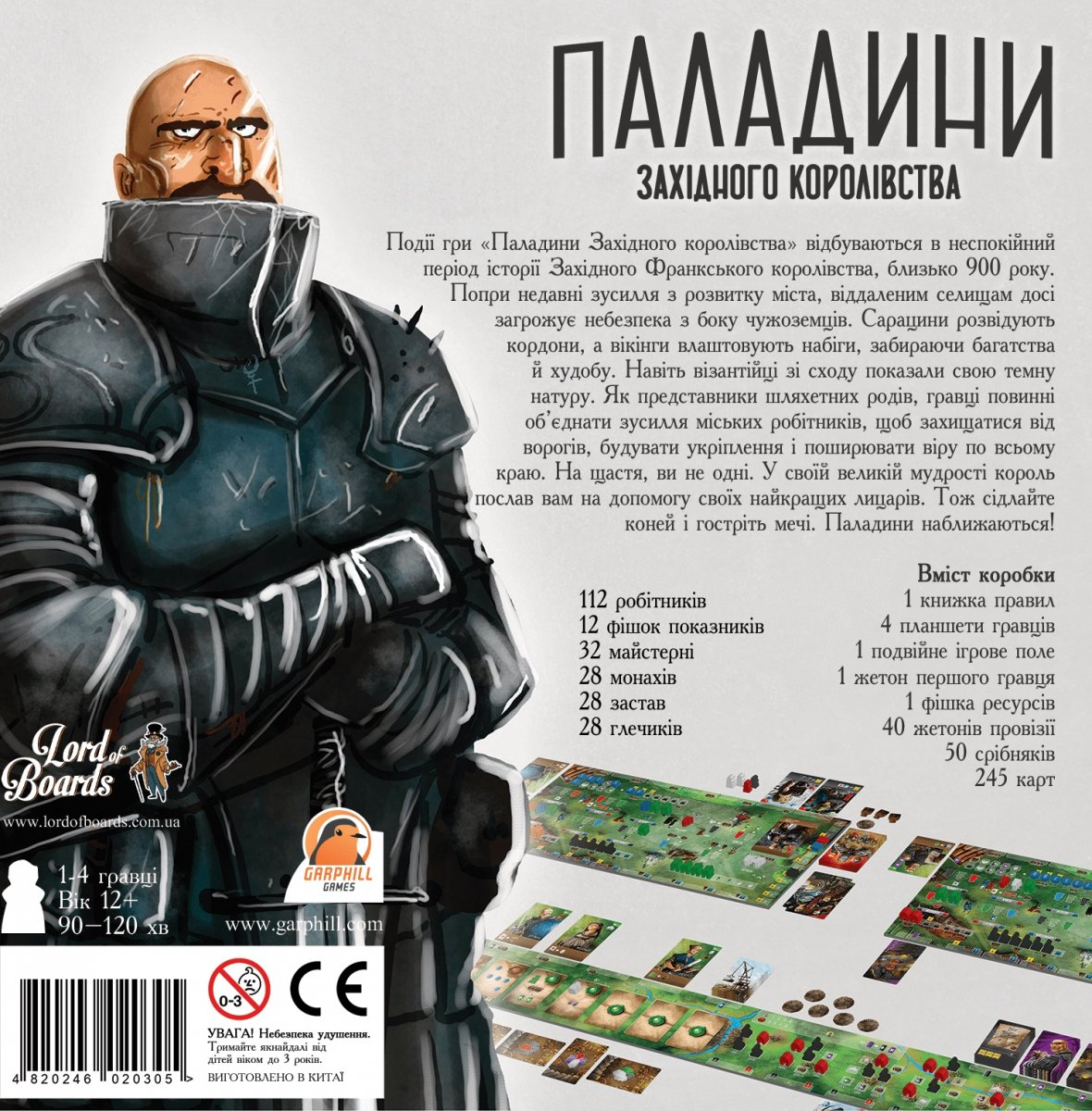 Вы уже бывали в Западном Королевстве? Конечно, не в реальности. Ведь машину времени, которая перенесла бы нас в конец первого тысячелетия нашей эры, еще не изобрели. Но зато Шем Филлипс и Эс Джей Макдональд придумали трилогию настольных стратегий, с которыми вы сможете перенестись в упомянутое государство и времена. «Паладини Західного Королівства (Паладины Западного Королевства УКР)» — одна из них! Её украинскую локализацию можно заказать в нашем магазине настольных игр, даже если вы не знакомы с другими играми серии — этот выпуск полностью независимый и отличается как сюжетом, так и механиками игры. Единственное, что осталось неизменным — это большое количество деревянных и других компонентов высочайшего качества.