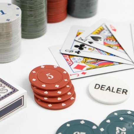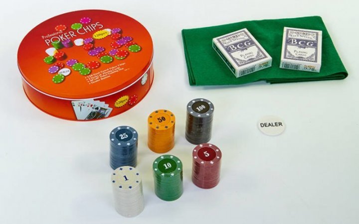 В данный набор входит 120 фишек 5 цветов (номиналы 1, 5, 10, 25, 50), фишка дилера, две карточные колоды с пластиковым покрытием и удобный круглый органайзер. А также в металлическом боксе вы найдете, что немаловажно, зелёное полотно игрового поля. Оно защитит стол, избавит от лишнего шума и создаст атмосферу настоящего игорного зала, позволяя забыть о времени и полностью отдаться игре. Проверьте удачу и способности к блефу с этим прекрасным набором для покера и других карточных игр!