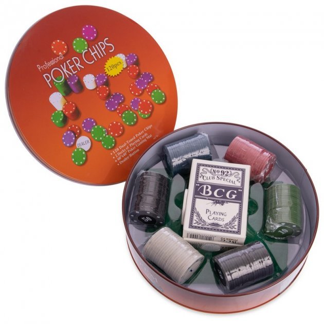 Настольная игра Покерный набор на 120 фишек в круглой металлической коробке (Poker)
