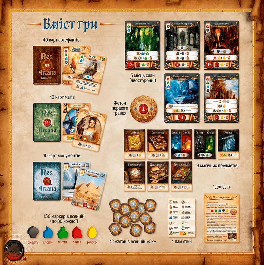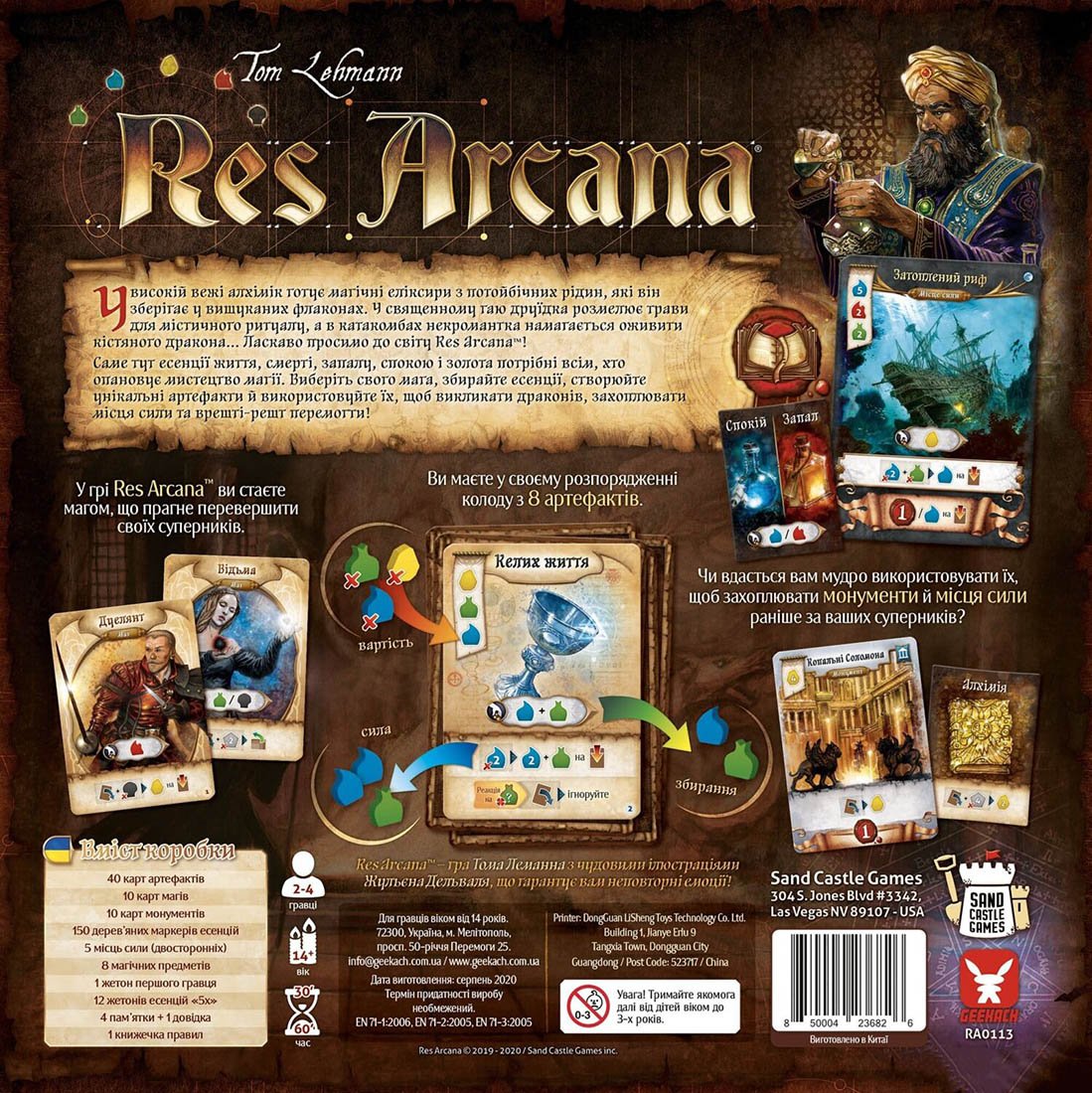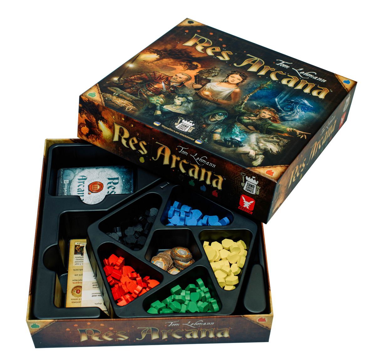 С «Res Arcana. Українське видання» новоиспечённых магов в количестве 2-4 штук ждёт несложная карточная стратегия, в которой прекрасно реализована механика драфта, менеджмента руки и персональных возможностей. Добавьте сюда крутой динамичный геймплей, отличное оформление и клёвый органайзер для разноцветных маркеров эссенций — и получите секрет отличного времяпрепровождения. Причем магия окутает вас с ног до головы: игроки за каждый раунд партии будут создавать артефакты, призывать с их помощью сверхъестественных существ, захватывать места силы и монументы.