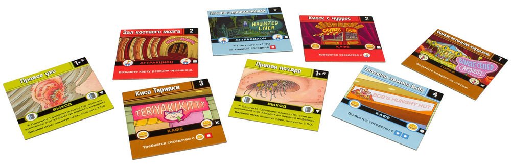 У 2-4 игроков окажется в распоряжении колода из 46 локаций парка, которые будут постепенно формировать игровое поле и приносить баллы, а также карты реакции организма на строительство (которые, кстати, предстоит изображать!). Вы будете перемещать по парку картонные фигурки персонажей на подставках и сталкиваться с разнообразными фишками инфекций. И всё это — в окружении жутко красивых иллюстраций в стиле Рика и Морти. В игре вам предстоит сражаться за самое теплое местечко внутри Рубена, продуманно размещая тайлы с разными локациями парка, двигать органы, противостоять болезням и пытаться набрать как можно больше очков, пока ваш «арендодатель» не сыграл в ящик.