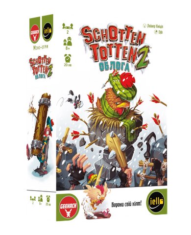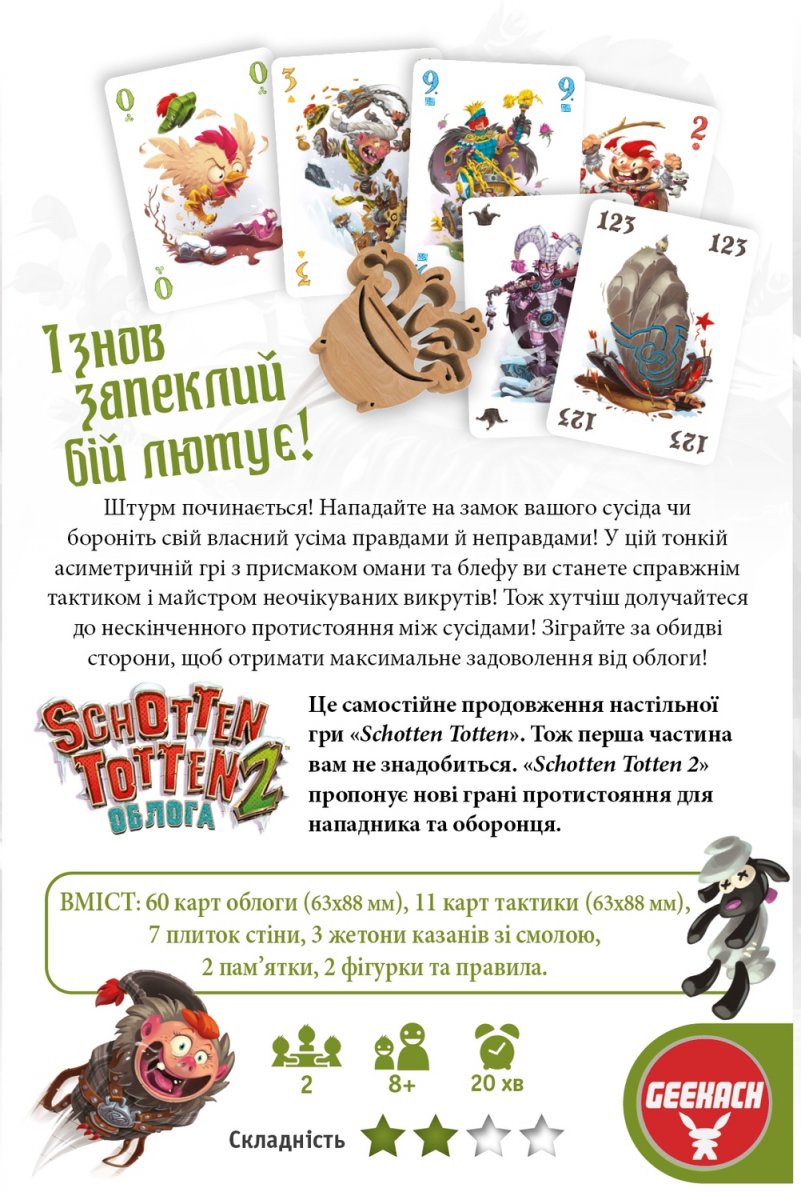 Но так как осада происходит напротив определенных участков стены, вам нужно будет учитывать также условия, указанные на конкретных плитках. А также не забывать про элемент блефа — ведь атакующий может убедить осажденного, что он проиграет, если отряд того ещё полностью не собран. Учтите ещё наличие карт тактики, которые позволят манипулировать картами ещё хитрее, и вы удивитесь сколько стратегических возможностей скрывается в этой мини-игре. «Shotten Totten 2. Облога (Осада УКР)» ещё и очень весело оформлена, так что понравится как детям старше 8 лет, так и взрослым. Готовы? Тогда к бою!