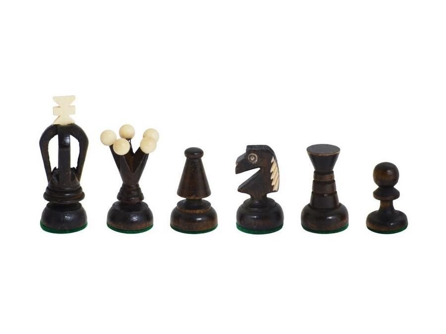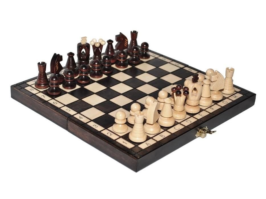 Шахматы небольшого размера можно легко брать с собой в поездку, на природу, в гости или на дачу, а также они удобнее для игр с детьми. Польский шахматный набор Small Kings — прекрасный представитель компактных шахмат. Фигуры в этом наборе сделаны из натурального дерева в Королевском дизайне (схожем с серией Роял) с королем 6 см и покрыты блестящим лаком. Шахматная доска 28,5 см размечена выжиганием и вручную окрашена в молочный и темно-коричневый (практически черный) цвета. Внутри есть два отсека для хранения фигур, а сбоку один золотистый замок. Шахматы Small Kings займут мало места, но подарят вам много удовольствия от игры.