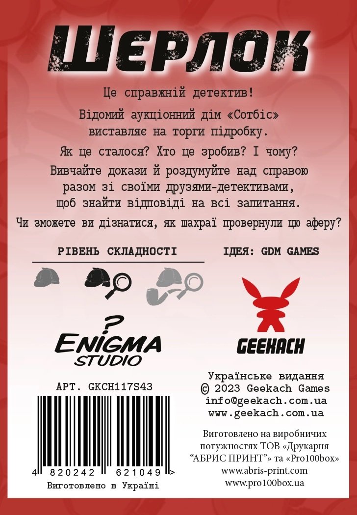 "Шерлок: Подделка" — это захватывающая детективная игра, где ты становишься помощником самого Шерлока Холмса в расследовании изысканного художественного преступления! Кто-то подделал бесценную картину, и тебе предстоит раскрыть все детали этого дела: кто преступник, как он проник в галерею, какие мотивы стояли за этим преступлением? Настоящий детективный опыт в формате настольной игры, где каждая подсказка может оказаться ключевой!