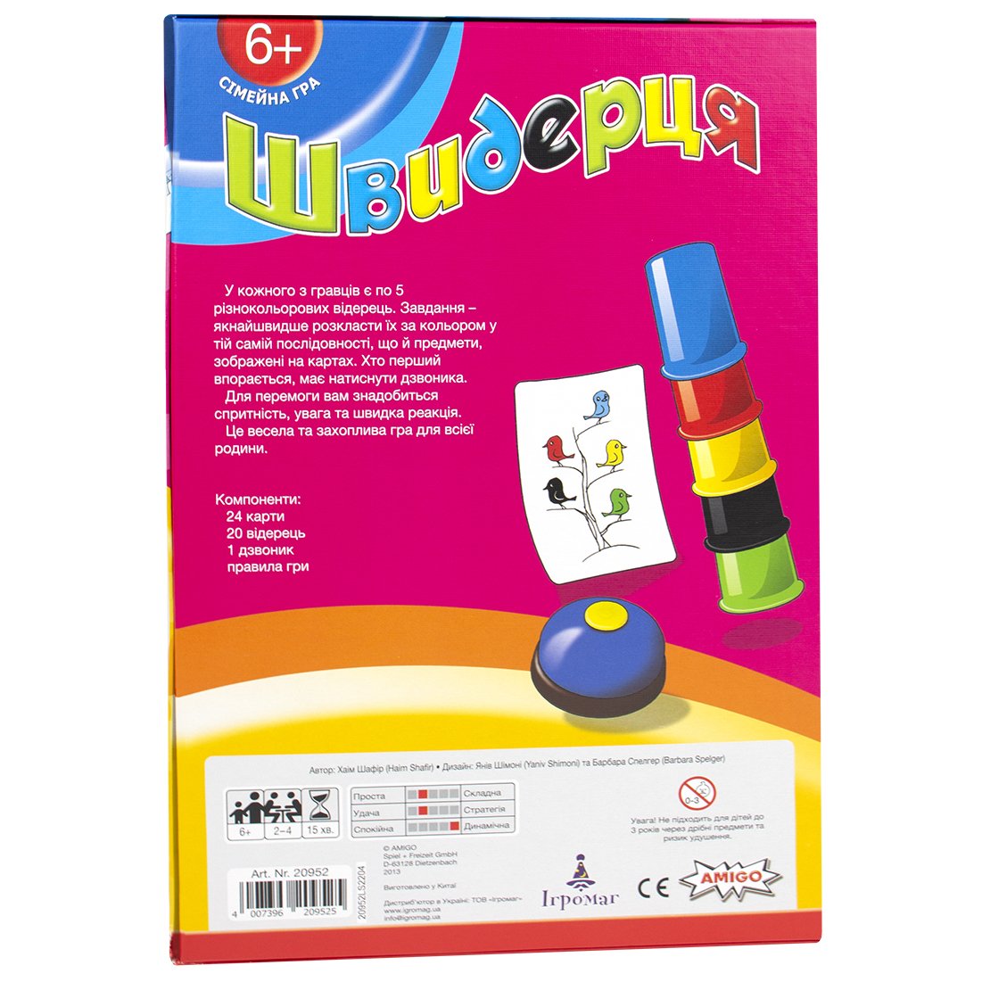 А если возьмете «Швидерця» на любую вечеринку или решите купить в семейную поездку — получите массу поводов для смеха и приятных воспоминаний. Простота правил, немецкое качество компонентов, украинская локализация и активный игровой процесс — что еще нужно для прекрасной игры?