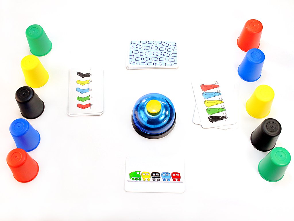 От 2 до 4 игроков получат по набору пластиковых ведерок 5 цветов, а между ними окажется стопка карт с заданиями и металлический звонок. Открыв первую карточку, нужно быстрее соперников правильно выставить перед собой показанную последовательность цветов и нажать на звонок. Думаете, это очень легко? На картинках изображены разнообразные сюжеты, а порядок предметов может быть как горизонтальным, так и вертикальным. Причем за ошибку полагается штрафное очко, а азарт не всегда дает сосредоточиться. Кстати, детям это почему-то удается легче чем взрослым, поєтому в вашей семье наверняка развернется настоящее веселое соревнование.