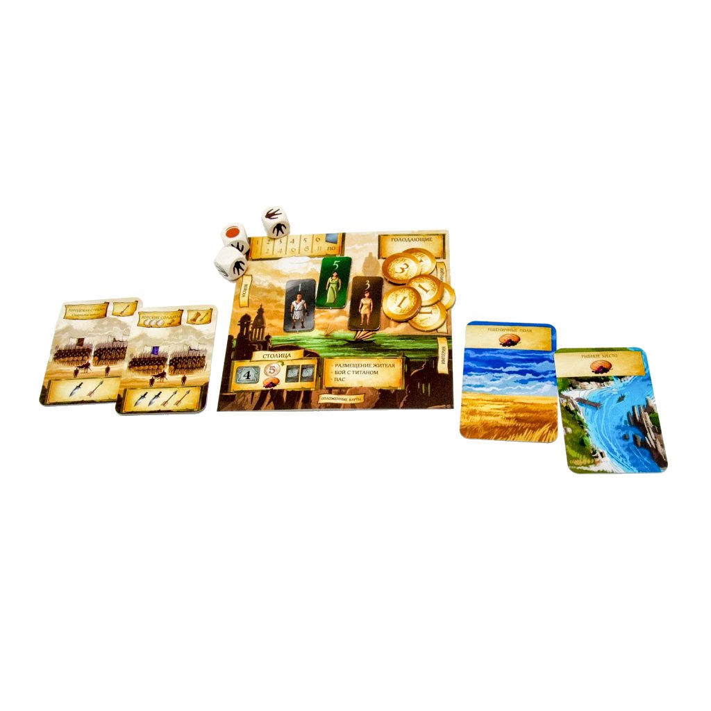 В настольной игре «Древний мир» каждый игрок получит начальную казну, провинции в своем владении и стартовые карты войск для начала развития своего государства. В течении 6 раундов ты даешь задания жителям для добычи ресурсов, увеличиваешь и направляешь войска для сражений с Титанами. После чего, как всякий мудрый правитель, кормишь работников, получаешь доход и не останавливаешься на достигнутом. Но помни о балансе между промышленной и военной сферой, ведь твоя задача собрать как можно больше комплектов карт поверженных титанов и присоединенных провинций с одинаковым цветом знамени на них. После подсчета очков за собранные комплекты, решится - государство какого правителя стало самым могущественным!