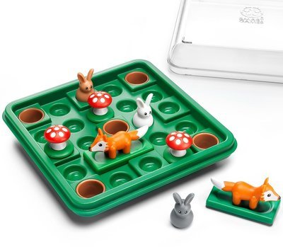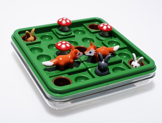 Задача игрока — выставить фигурки на поле, как показано на картинке в выбранном задании, а потом найти для пушистиков самый короткий путь в норки. Но загвоздка в том, что зайчики любят скакать, как попрыгунчики, поэтому их фигурки можно перемещать, только перепрыгивая через препятствия. Игроку предстоит передвигать фигурки лис, как в пятнашках, а также строить маршрут зайцев к норкам через мухоморы или спины товарищей. Такое развлечение прекрасно тренирует умение планировать свои действия и решать логические задачи.