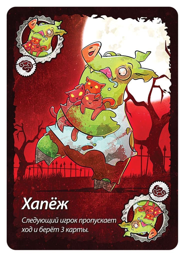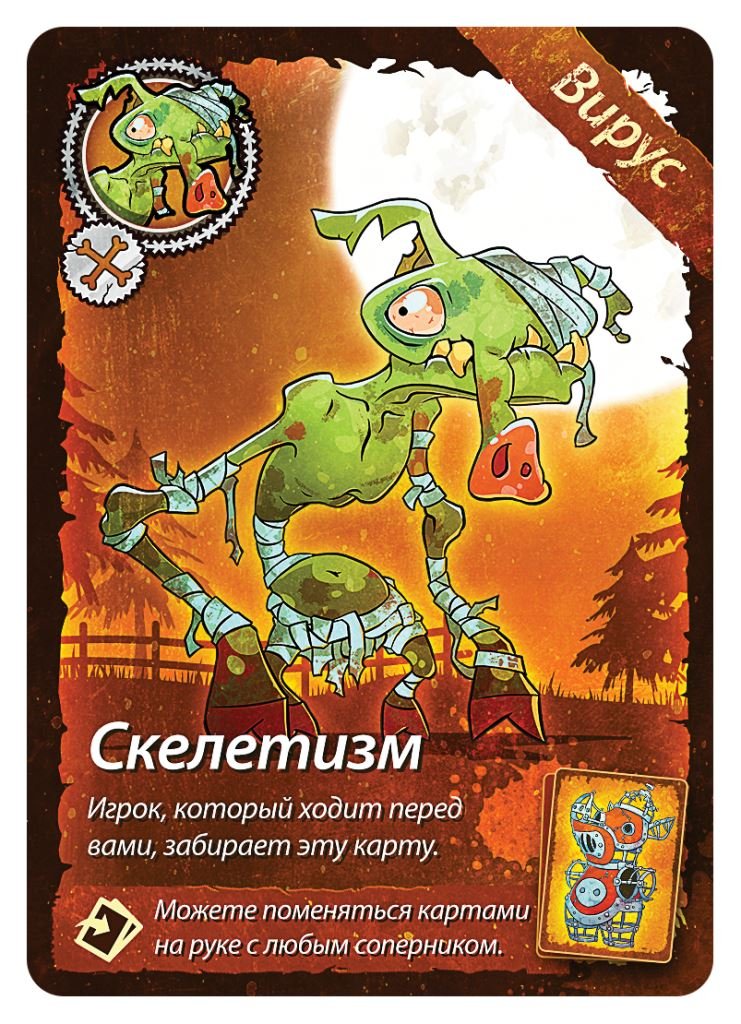 Как и в классическом варианте игры, в «Свинтус Зомби» вам предстоит избавиться от всех карт на руках. Игровая механика схожа с правилами «Уно»! Вот только на этот раз карты лучше скидывать как можно оперативнее, ведь в свинячем мире царит атмосфера зомби – террора! Всюду то и дело к вам липнут инфекции и вирусы! Список заразных свинских напастей: «Некрокашель» и «Грелка-горелка» - с этой картой игрок раздает по одной карте с руки рядом сидящим игрокам. «Мертвосопли» и «Уморин» - каждый соперник в игре берет с колоды по две карты. «Скелетизм» и «Штыроид» - владелец этой карты имеет право поменяться всеми картами с руки на карты любого соперника на выбор (даже если их количество не совпадает). «Гнилозубье» и «Буравушка» - владельцу этой карты каждый соперник должен с руки показать карту вакцины. У кого вакцины не окажется – берет 3 карты с колоды.