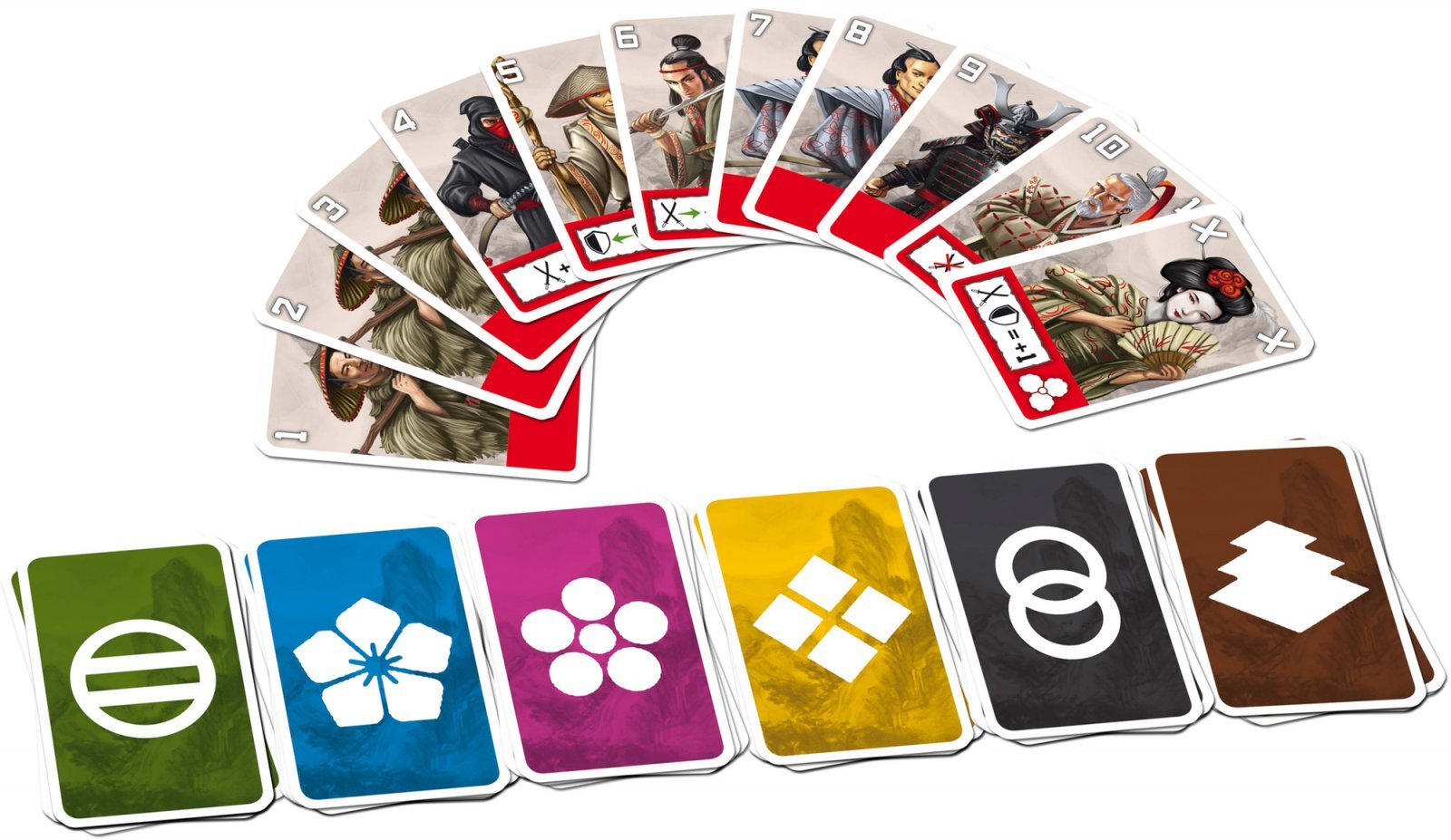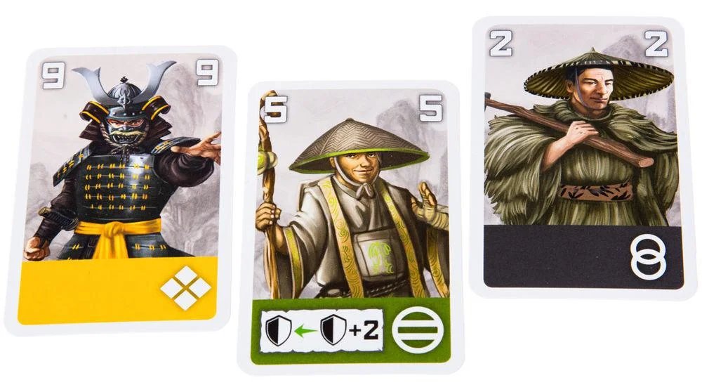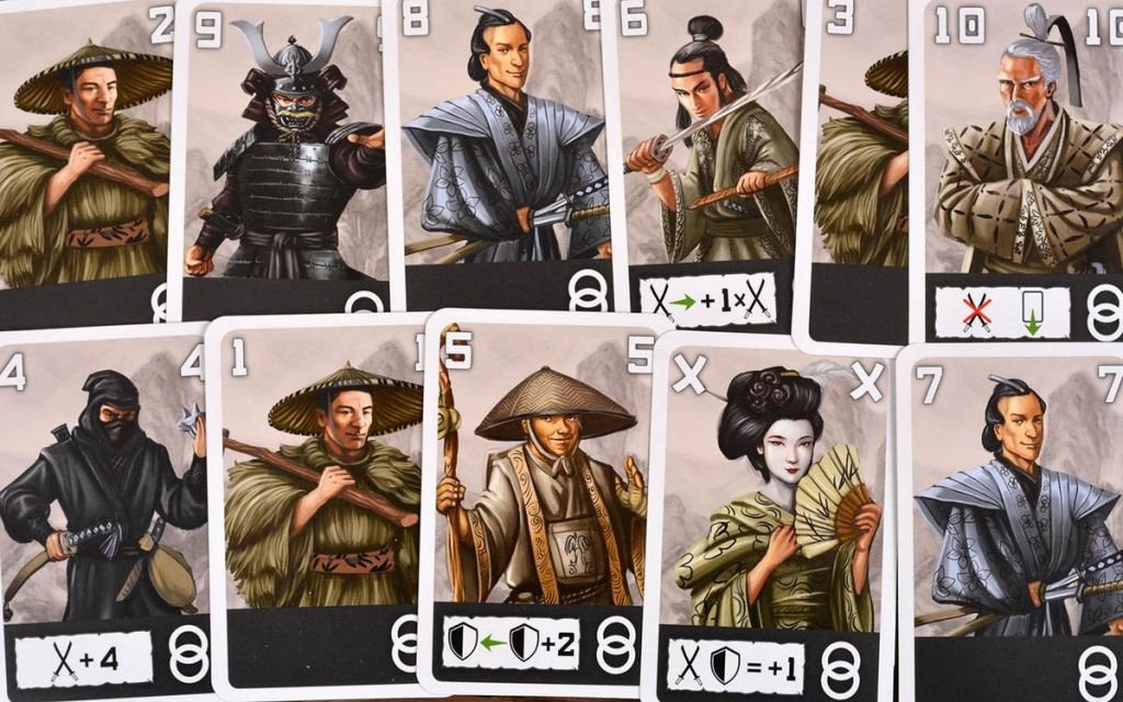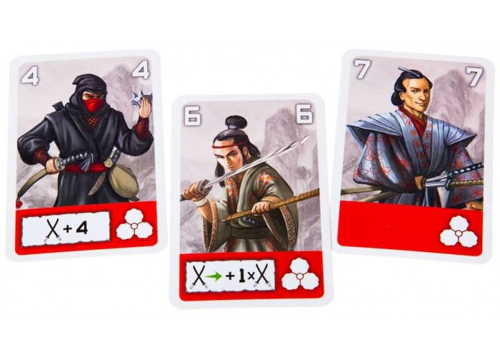 У каждого игрока будет по 11 карт определенного цвета и номинала, среди которых будут как крестьяне с самураями, так и более ценные ронин и сёгун. Выложив по три карты в ряд рубашками вверх, игрок вскрывает одну из своих карт и указывает, какую карту вскрыть противнику. Сравнение силы решает исход боя — либо нападающий забирает себе в плен проигравшего, либо сам отправляется в сброс, лишь увидев на мгновение одну из карт противника. Вот тут вам в игре «Тэнно» пригодится память, чтобы в следующий раз атаковать не в слепую. Да и свои карты нужно запоминать, ведь опустевшее место всегда пополняется воином с руки.
