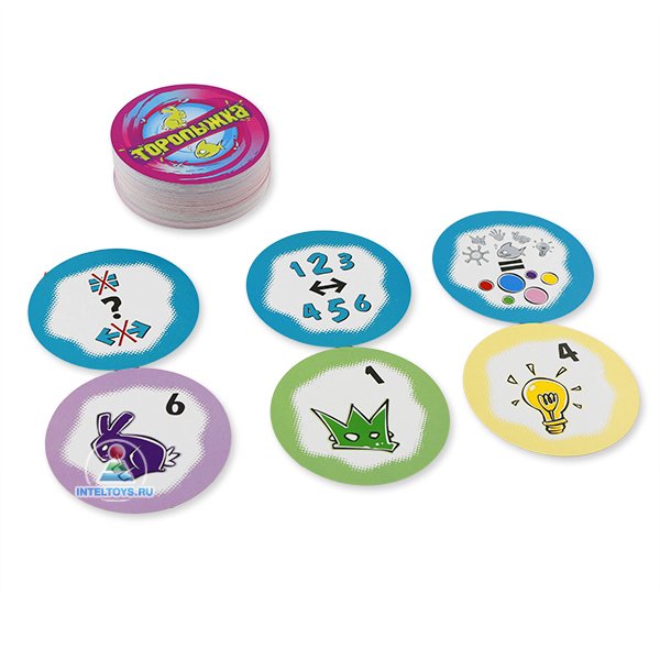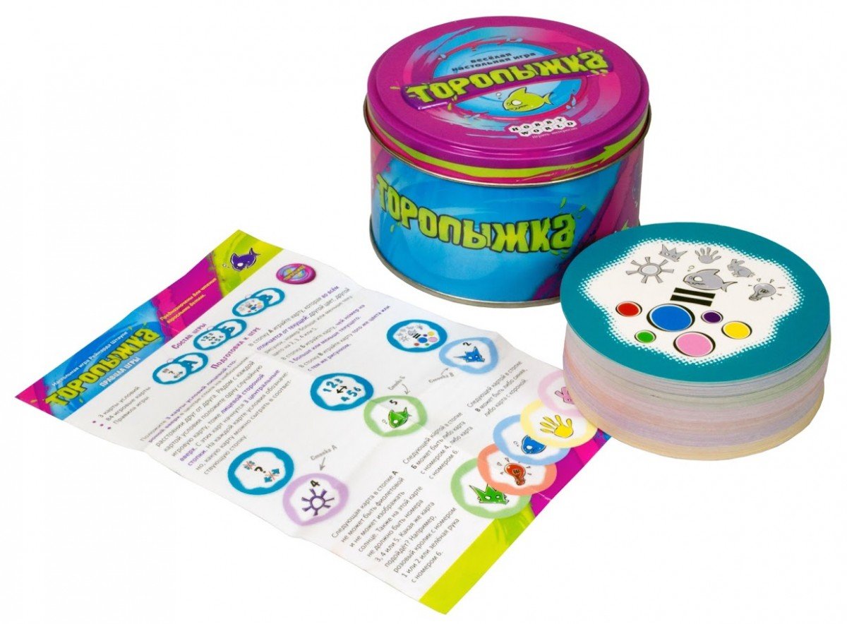 Что может скрываться в компактной и красочной жестяной коробке? Конфеты, пуговицы, несметные сокровища? Маленьким непоседам точно захочется в нее заглянуть, а удовольствия ее содержимое принесет не меньше. Почему? Да потому что внутри веселая и стремительная игра «Торопыжка», в которой позитивные эмоции получают все, а выигрывает самый внимательный и сообразительный. Правила «Торопыжки» просты и доступны для детей уже от 6 лет, а вот сам игровой процесс хорошенько потренирует скорость реакции, аналитическое мышление и наблюдательность даже у взрослых. Ведь всем необходимо быстрее соперников избавиться от своих карт на руках, выкладывая их на стопки, где верхняя карты подходит по условию. Круглые яркие карты при этом имеют свой цвет, число и рисунок, а совпадение нужно будет искать по трем разным заданиям. Если ваша карта отличается по абсолютно всем признакам от верхней в стопке, что лежит под таким условием - смело кладите ее сверху, следующая по числу - в стопку рядом, а если совпадает по цвету или картинке - в третью. В чем загвоздка? В том что очередности хода в игре нет! Все спешат избавиться от своих карт, и ситуация на игровом столе постоянно меняется, а значит, задача по поиску соответствий только усложняется. Детям 3-4 лет понравится более медленный и вдумчивый вариант игры без соперников, а торопыжкам по-старше - соревнования даже со взрослыми. Играйте и развивайтесь весело и с огоньком!