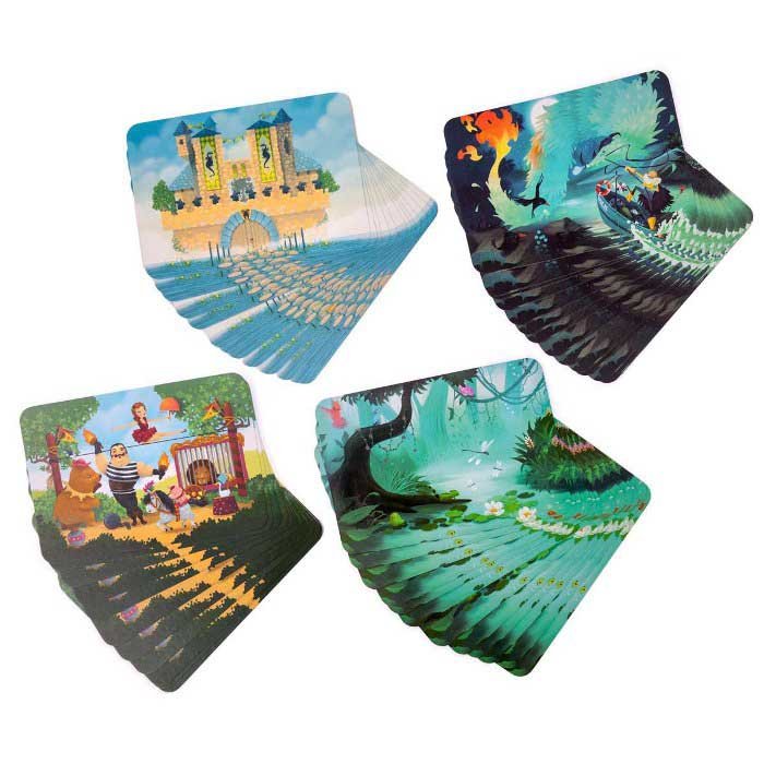 50 двухсторонних карточек с 4-мя видами иллюстраций (волшебный замок/бродячий цирк, лесное озеро/охота на дракона)правила игры