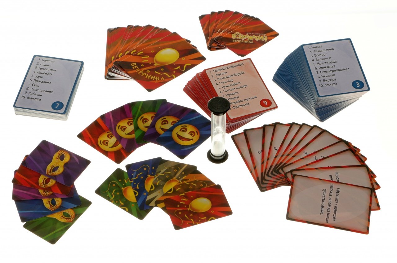 На 196 картах написано почти 2000 слов, которые предстоит обьяснять разными незаурядными способами. Как бы вы изобразили жестами слово «Причал»? Или возможно ли вообще нарисовать слово «Слухи»? Своими стимулирующими испытаниями «Воображарий» разгонит ваш мозг на максимум! А с картами испытаний «Вечеринка» объяснять слова станет ещё более вызывающе и интересней!