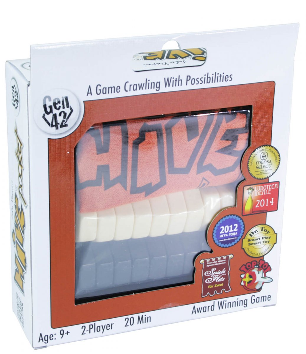А если мы вам скажем, что в Ход Конём есть шахматы с букашками? Именно так иногда называют абстрактную игру для двоих «Hive (Улей)». Ведь она так похожа по своей глубине на эту знаменитую дуэльную стратегию. А теперь ещё появилась компактная версия — «Улей. Карманный (Hive pocket)», которую легко всегда иметь под рукой. Всё что нужно — это захватить с собой симпатичный мешочек с 26 гексагональными фишками черного и белого цветов. На них изображены разные насекомые, каждый из которых, как шахматные фигуры, ходит по-своему, поэтому может блокировать фишки противника. А основной целью игры является окружение королевы оппонента. Для этого нужно выкладывать букашек на стол, чтобы они гранями касались фишек вашего цвета, стараясь постепенно взять вражескую матку в кольцо. Но сделать это не так уж просто. Ведь, несмотря на простоту правил, «Улей. Карманный (Hive pocket)» может превратиться в нешуточную битву умов, где лишь вашему интеллекту под силу заслужить победу.