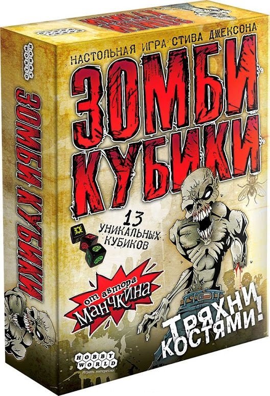 Динамичная игра на костях «Зомби кубики» временно превратит всех участников в бодреньких монстров, цель каждого из которых — собрать за партию больше всего очков. Каждый ход игрок бросает 3 из 13 шестигранных кубиков, которые отличаются по степени риска, и получает очки за выкинутые мозги. Но кроме них, на пути поиска пропитания несчастных зомби могут поджидать слишком быстрые жертвы или противные владельцы огнестрельного оружия. И если выпавший символ убежавшей добычи еще можно перебросить, то 3 накопленных выстрела не сулят ничего хорошего.