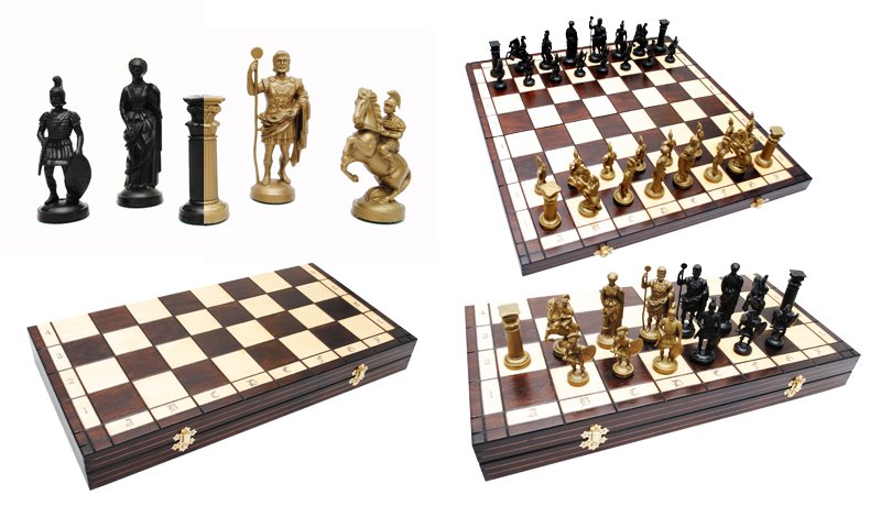 Фігури в цьому шаховому наборі — це високодеталізовані мініатюри спартанських воїнів і правителів. Вони досить великі (висота короля - 100 мм), відлиті з високоякісного пластику, пофарбовані в золото і чорний та мають накладки для захисту дошки. Розкладна шахівниця (шириною 50 см) виконана з натурального дерева в бежево-коричневих кольорах і укомплектована зручним органайзером з місцем під кожну фігуру.