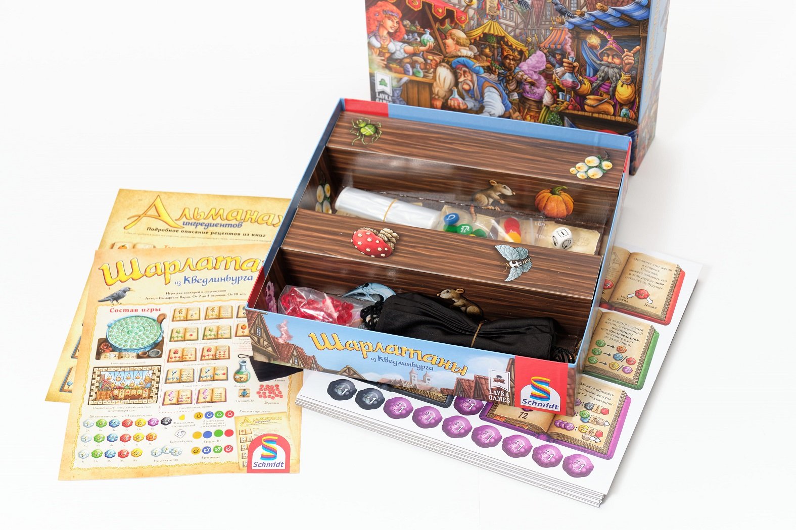 У цій захопливій настолці 2-4 гравцям належить по спіралі заповнювати свої планшети-котли різноманітними інгредієнтами, викладаючи їх жетони на відстані, рівній вказаному на них числу. Інгредієнти доведеться тягнути наосліп з індивідуальних мішечків, але ось те, що там буде знаходитися — багато в чому залежить від вас! Ви зможете купити необхідні елементи зілля з книг рецептів на ігровому столі, тим більше що частина з них принесе бонуси відразу, а інші — в кінці гри. Поступово заповнюючи спіраль котла, шарлатани з Кведлинбурга отримуватимуть цінні рубіни та переможні очки, а випереджаючи суперників або досягнувши останнього поділу — ще ряд додаткових бонусів. І так до кінця 9 раунду, коли хтось набере найбільше очок.