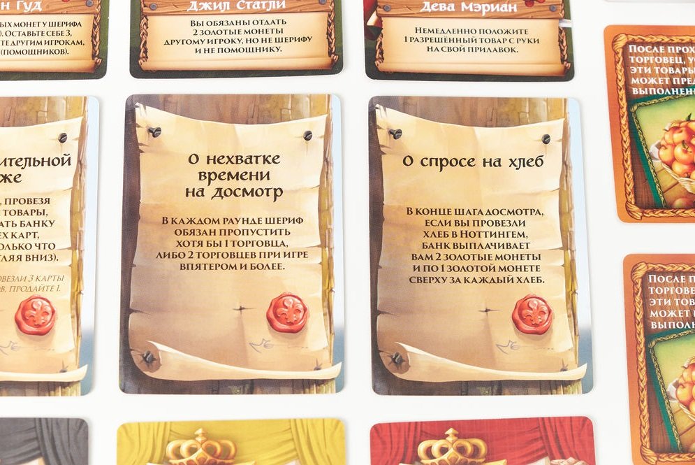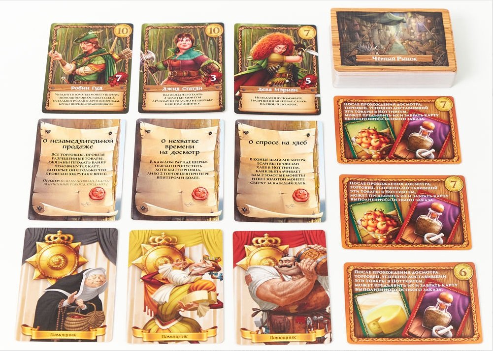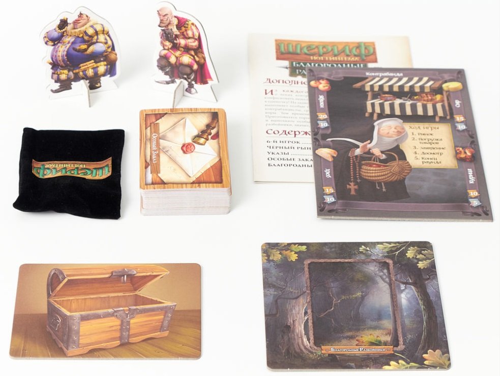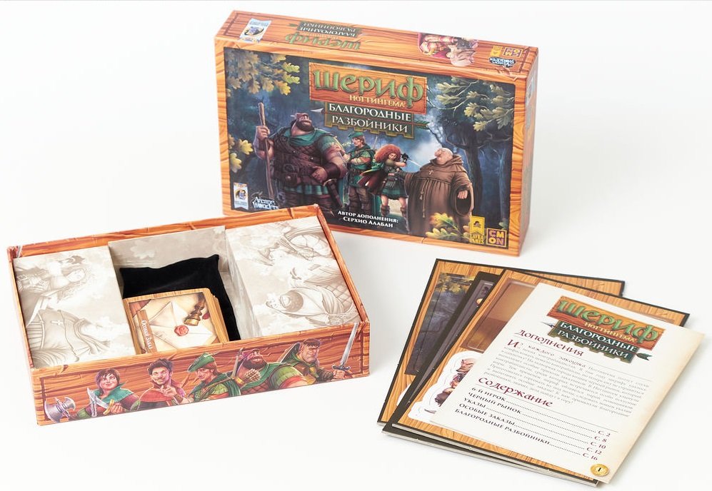 Ще додадуться закони (карти з ефектами, які буде зачитувати шериф), чорний ринок (який зможе купити у вас певні товари, якщо ви ризикнете їх провезти) і карти спеціальних замовлень, що дають бонуси за певний склад мішків. Ну й останнє нововведення (і причина, чому дане доповнення було названо «Шериф Ноттінгема. Благородні розбійники») — це контрабанда людей. Точніше, можливість допомогти розбійниками з Шервудського лісу проникнути в місто, звичайно, не безкоштовно. Який контрабандист відмовиться від нового способу заробити? Шериф Ноттінгема таких не зустрічав. Тому перед цим доповненням неможливо встояти!
