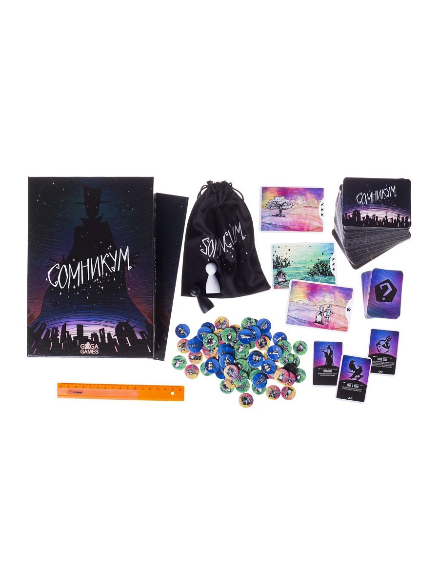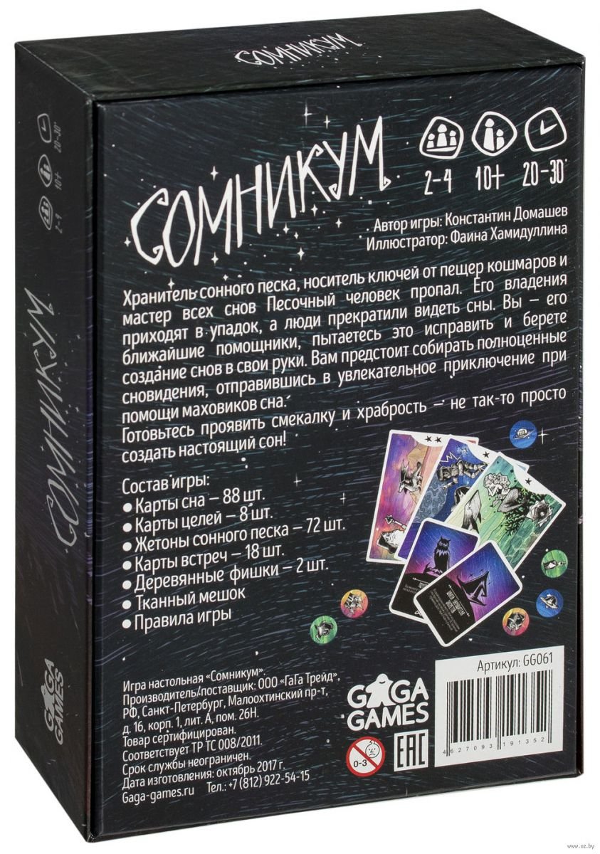 Важко собі уявити життя зовсім без сновидінь, чи не так? Але саме це станеться в новій настільній грі «Сомнікум», якщо від 2 до 4 осіб не замінять раптово зниклого Пісочного людини! Робітка їм належить незвичайна і до того ж дуже захоплююча: потрібно буде створювати максимально насичені сновидіння! Зачаровують ілюстрації, барвисті ігрові елементи і цікава механіка гри «Сомнікум» легко створять незабутню атмосферу для гравців 10-99 років. Всього-то й потрібно, що розкласти по колу карти з кадрами з сновидінь, викласти в центр мішечок з жетонами сонного піску і розставити маховики сну. Останнє особливо інтригує, чи не так? Насправді, це дві дерев'яні фішки, які гравці будуть рухати по колу, щоб вибирати карти, і зустріч яких знаменує кінець, правда, не світла, а раунду. На столі можуть попастися і чорні карти кошмарів, віднімають бали в кінці гри, і кадри з сновидінь 3-х кольорів (в залежності від сюжету: казка, підводний світ або космос), які приносять різну кількість очок.