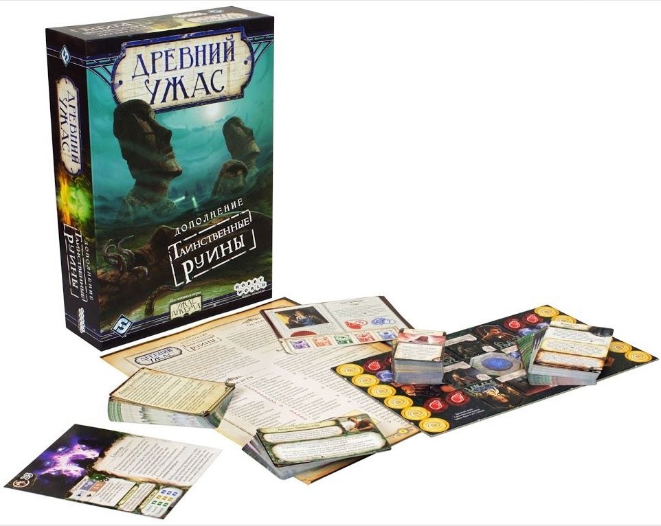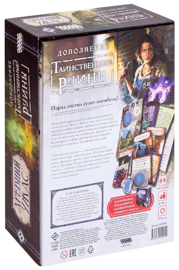 У коробці «Древний Ужас. Таинственные Руины» ви знайдете все необхідне для розслідування: додаткові жетони, нові карти міфів, активів, станів, заклинань і контактів. Усі компоненти достатньо додати до базової гри «Древній Жах». Шість монстрів (від знайомих культистів до Зоряного Вампіра) стануть вашим новим головним болем, а 4 унікальних персонажі (від співачки до колишнього ув'язненого) — новою надією на запобігання апокаліпсису. Разом з командою розгадайте секрети стародавніх руїн, щоб знищити провісників кінця світу і зупинити смертоносну Сизигію!
