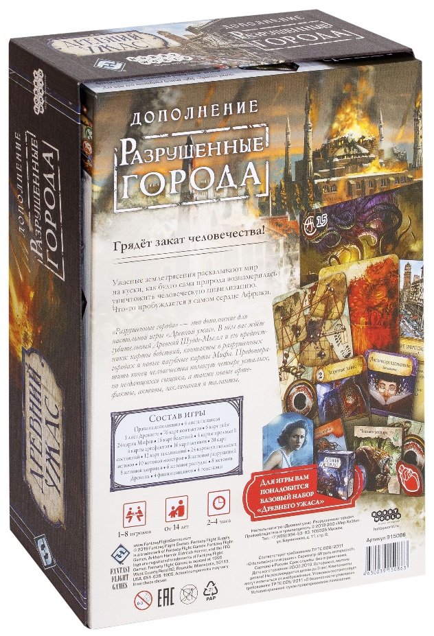 Унікальні активи, свіжі заклинання, корисні артефакти і, звичайно ж, 4 нових герої з унікальними здібностями покликані не допустити апокаліпсису, але, як завжди, перемога буде залежати лише від вас і вашої команди. Ця новинка 2019 року також вводить у гру режим «управління долею» і правила «божевільної складності». Так що доповнення «Древний Ужас: Разрушенные города (Eldritch Horror: Cities in Ruin)» по-справжньому урізноманітнить вашу кооперативну подорож у всесвіт Міфів Ктулху!