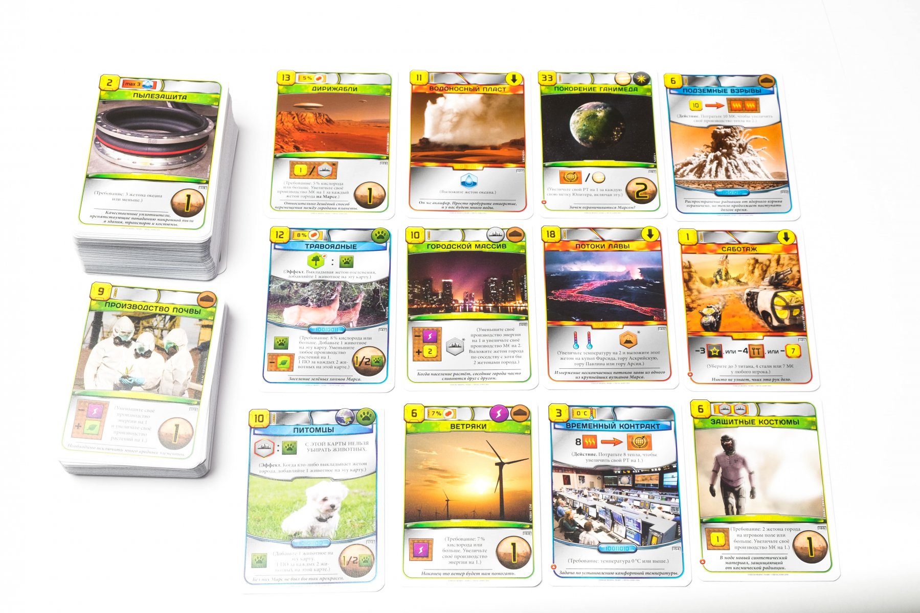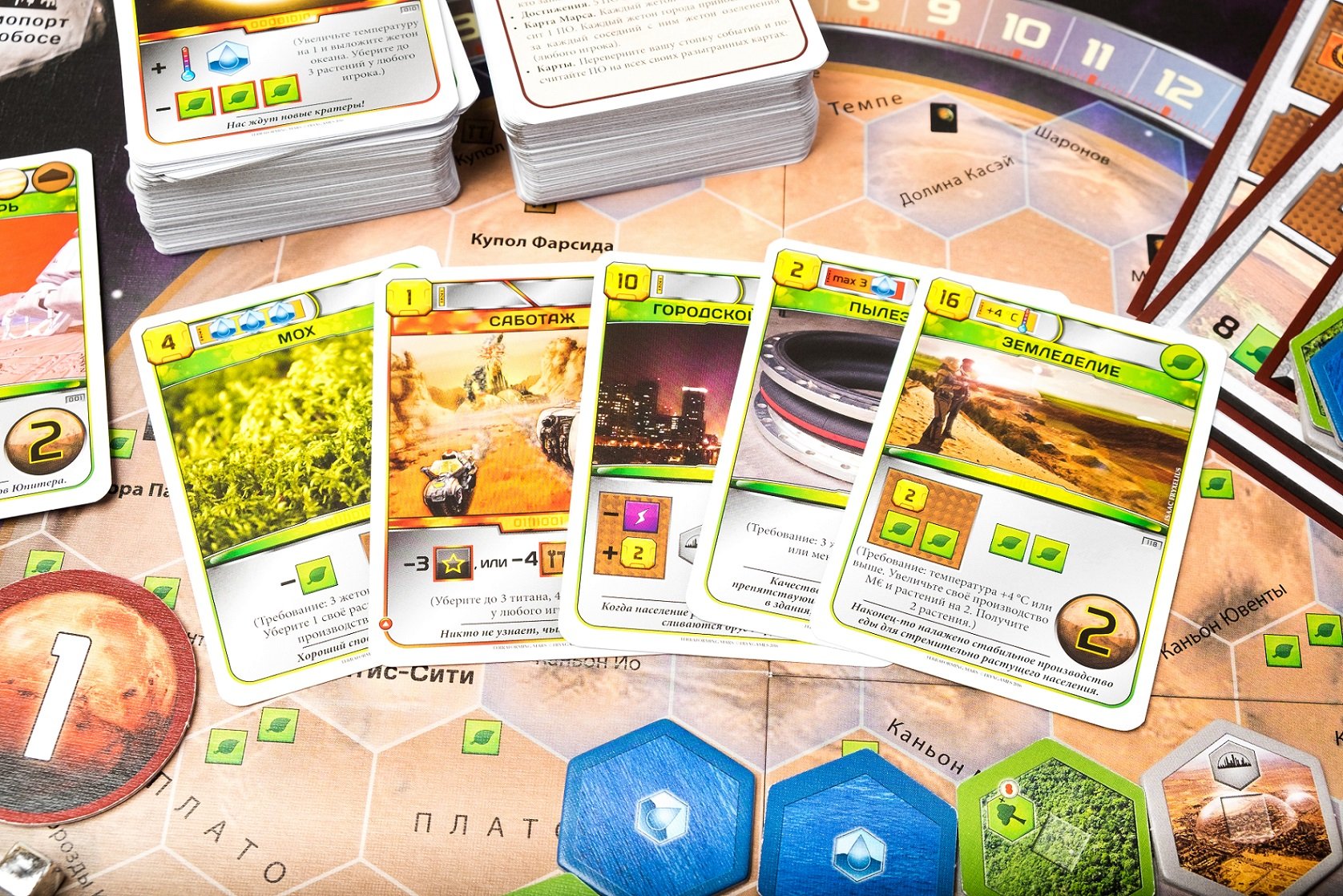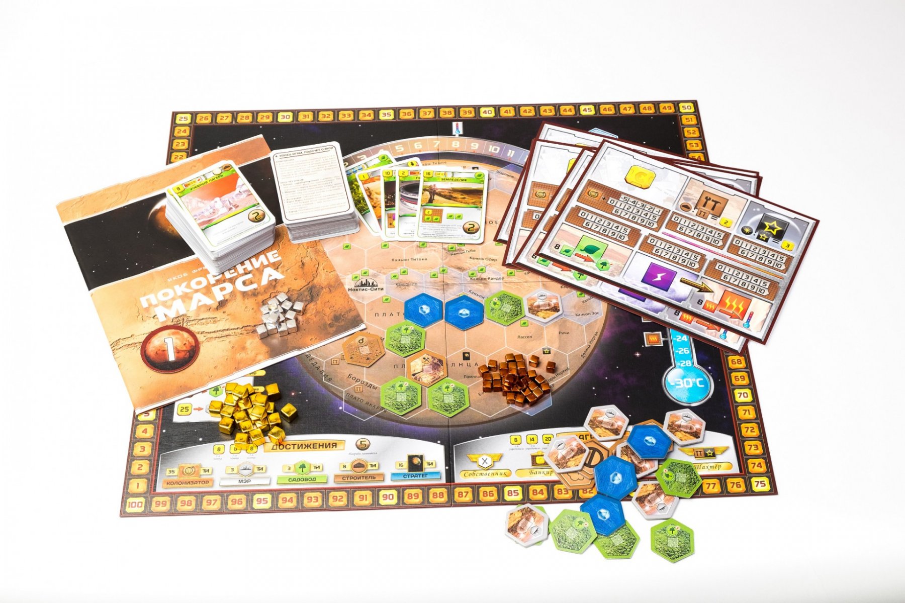 Карти не повторюються, приносять різний ефект (від миттєвого до пасивного) і можуть давати додаткові переваги при їх вдалої комбінації. Уявляєте, якою кількістю стратегічних і тактичних можливостей володіє гра? Бомбанути по Марсу великим крижаним астероїдом для отримання вологи, відправити парникові гази з Землі для збільшення температури, та й просто вкрасти енергію у суперника - чим тільки марсіани не жартують. Частина з карт може бути розіграна, коли рівень кисню, океану і температури на планеті досягне певного значення. Ці параметри гравці прагнуть підвищити, щоб отримати додаткові очки за внесок в Терраформирование і для розвитку власної колонії. Виставляючи на поле із зображенням планети гекси води, лесов¸ міст і видобутку ресурсів - ви не тільки змагаєтеся за владу над територією і заробляєте бали, а й впливаєте на загальні кліматичні умови, а значить - і один на одного. Марс не гумовий, тому взаємодія між колоністами буде на високому рівні, а конкуренція не дасть занудьгувати. Якщо додати до цього продуманість, глибину і реіграбельность стратегії «Підкорення Марса» - то стане зрозуміло, чому ця гра стала бестселером. Але краще, як то кажуть, один раз спробувати, ніж кілька разів почути. Підкорити Марс, можливо, буде не дуже просто, але точно - космічно цікаво!