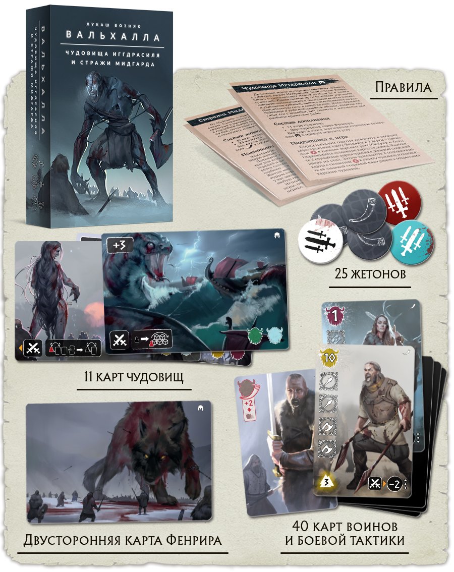 На вас чекає зустріч з різноманітними чудовиськами скандинавської міфології від ожилих драуґів до сина самого Локі — величезного вовка Фенріра. Але вам не потрібно буде боротися з ними (в грі і так достатньо суперників), ви зможете взяти в полон цих грізних монстрів і використовувати їх здібності! Так, звичайно, не безкоштовно, адже, щоб захопити таких чудовиськ, вам доведеться пожертвувати своїми воїнами. Але останніх побільшає — адже дане доповнення також містить нових бійців з небаченою раніше механікою жетонів, які дадуть їм особливі стани. Причому дані модулі (вартових і чудовиськ) ви можете використовувати як разом, так і окремо. З доповненням «Вальхалла. Чудовища Иггдрасиля и стражи Мидгарда» на вас чекає не одна легендарна битва на славу Одіна!