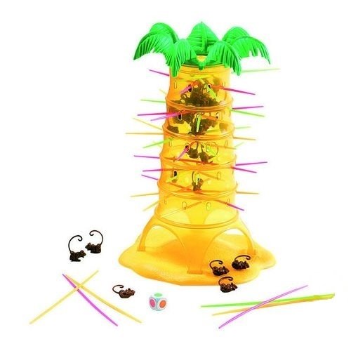 Починаючи гру «Веселі мавпочки» учасники збирають яскраву пластикову пальму з порожнистим стволом і пронизують її спеціальними різнокольоровими паличками - вони будуть виступати в ролі гілок для спритних приматів. Зверху засипаються мініатюрні хвостаті фігурки мавпочок, які повисають на гілках в хаотичному порядку. Кидаючи по черзі кубик, гравці витягують палички випав кольору, намагаючись потривожити якомога менше мавп. Ті мавпочки, які з дерева падають, дістаються винуватцю, а в кінці гри перемагає той, у кого їх буде менше.