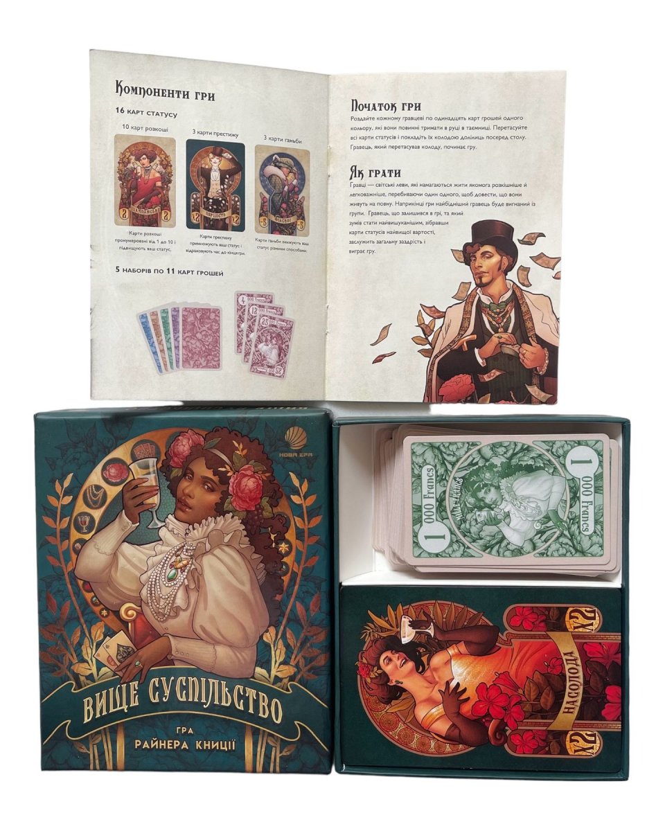 «Вище суспільство» – захоплююча настільна гра, яка занурює кожного учасника у світ розкішного життя, конкуренції та швидкого розвитку. Це яскрава настілка, яка запрошує вас у незабутню подорож, де ви будете змагатися з іншими гравцями, щоб стати найбагатшою та найвпливовішою особою.