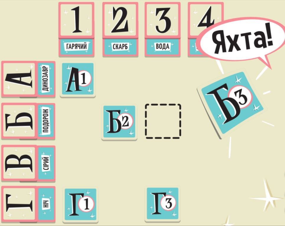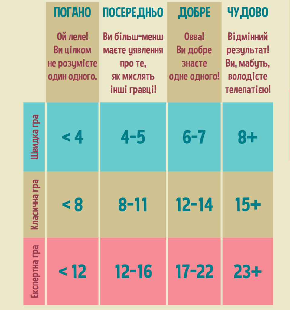 Адже в цьому веселому кооперативному патігеймі українською мовою потрібно придумувати підказки з одного слова, які б пояснювали відразу два слова, а це не так вже й легко! Хоча правила дуже прості: гравці викладають ряд цифр і стовпець букв, утворюючи систему координат. До кожної картки також викладається випадкове кодове слово, а ведучий витягує першу плитку координат (наприклад, Г2). Тепер його завдання натякнути гравцям на цю координату, де, наприклад, Г — це літо, а 2 — це вода. Найзрозумілішим варіантом буде «пляж», і якщо гравці відгадають, то картку координати можна буде викласти на відповідне місце. Мета — заповнити якомога більше клітин, але з огляду на 100 різних слів, на вас чекає маса комбінацій, велика частина з яких не так проста. До речі, складність гри «Влучні підказки» можна регулювати розміром поля і грою на час, а ваше вміння розуміти один одного з півслова перевірити за допомогою таблиці балів.