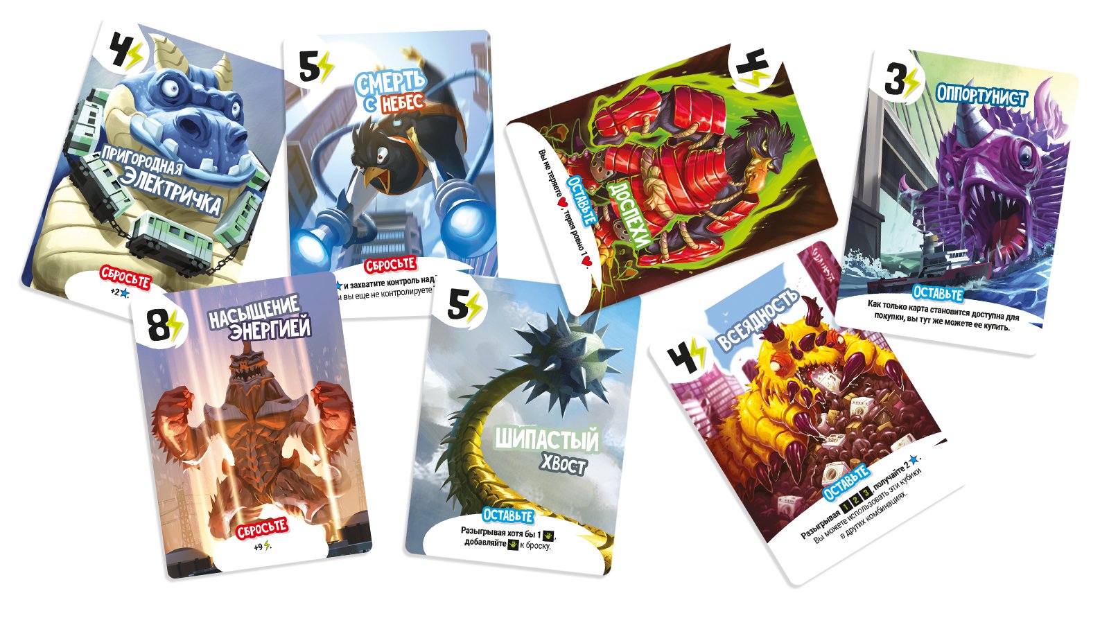 Ось тільки поки ви збираєте урожай очок, знайомлячись зі столицею Японії в якості «царя гори», все атаки супротивників сиплються саме на вас. Для того щоб нападати, відновлювати здоров'я, заряджатися енергією і просто отримувати очки за руйнування в мегаполісі, гравці кидають 6 спеціальних кубиків з символами. При цьому отриманий результат можна перекинути до 2-х разів, щоб отримати відповідне дію для обраної вами стратегії (куди ж без неї в одному з найбільших фінансових центрів світу). Енергію гравці отримують у вигляді прозорих зеленних кубів, які можуть витратити на особливі карти здібностей тривалого і разового ефекту. Всього в колоді 66 таких карт (з різними за ступенем безумства властивостями і барвистими ілюстраціями), тому способів насолити іншим гравцям і посилити свого монстра буде більш ніж достатньо! Веселощі веселощами, але завдання будь-якого поважаючого себе мутанта - стати найкрутішим, а для цього потрібно або набрати 20 очок, або знищити всіх суперників. І тоді ви зможете побити себе в груди кулаками і прокричати щось переможне. Слава і печеньки Володареві Токіо!