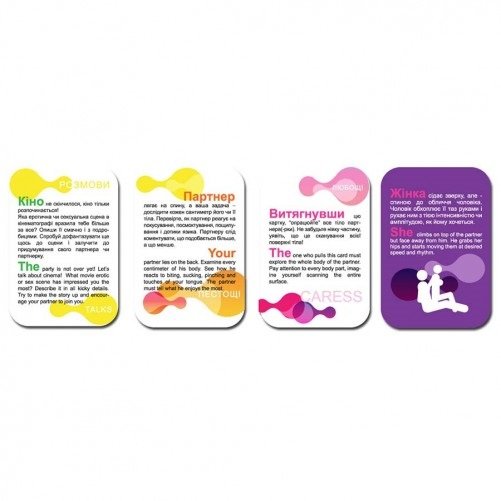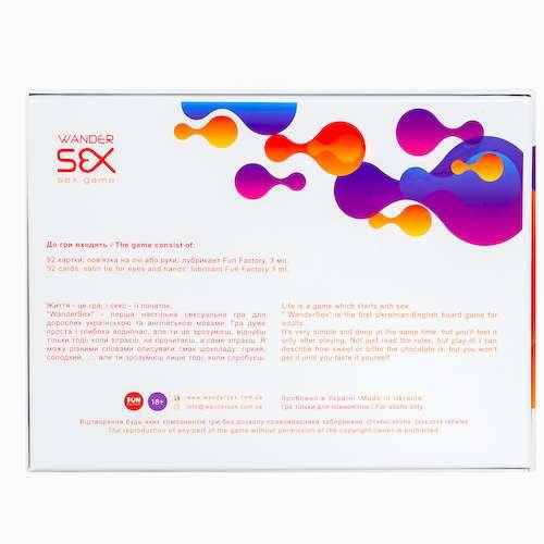 Причому картки із завданнями та правила написані відразу двома мовами: українською та англійською. Тому дана еротична гра може стати справді інтернаціональним подарунком і символом дружби різних народів. Закохані всіх країн єднайтеся (по двоє)! Нумо творити любов і грати в «ВандерСекс (WanderSex)».