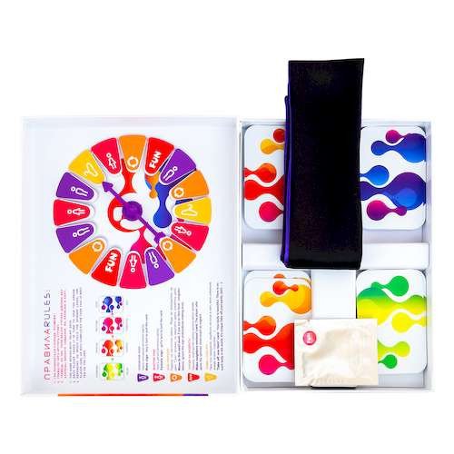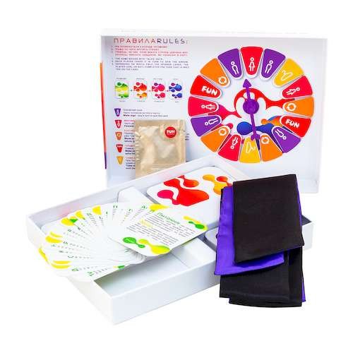 У коробці з таким стильним і лаконічним дизайном на вас чекають пов'язка на очі (або для рук), гель-лубрикант (вам же вже є 18 років, чи не так?), 92 карти із завданнями та ціла карусель задоволення. Каруселлю називається коло зі стрілкою, крутонув яку, ви дізнаєтеся, що вам треба зробити: зняти з себе частину одягу, відкрити картку із завданням, запропонувати це зробити партнеру або перейти на новий поглиблений рівень насолод.