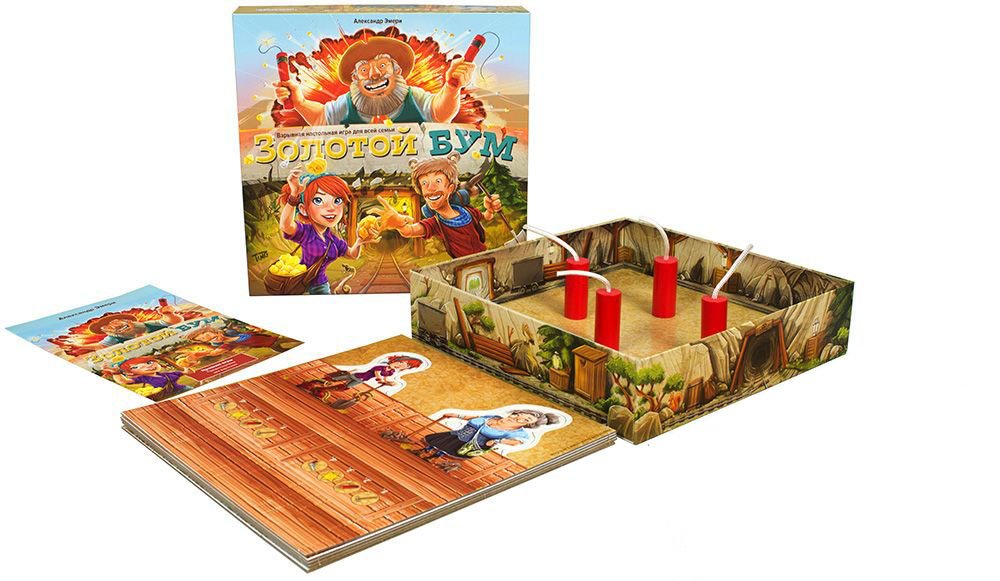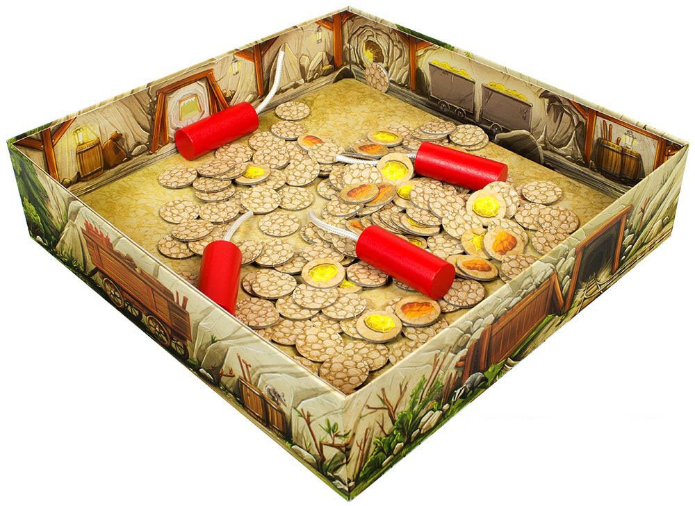У цій незвичайній грі для всієї родини ви перевтілитися в 4-х героїв вестернів (старше 6 років) і підете в шахту на пошук золотих самородків, прихопивши з собою трохи динаміту. Кидаючи його важкі барила на дно коробки повне жетонів, вам треба швидко по одному збирати перекинуті жетони здобичі. Причому серед них може виявитися не тільки справжнє золото або пірит (камінь схожий на нього і званий «золотом дурнів»), але і жетони дій або різних підземних мешканців. Останні — теж можуть бути вам корисні. Наприклад, револьвер дозволить зіграти з конкурентом у дуель, а кирка — перевернути 5 додаткових жетонів. Якщо ж динамітом буде потривожений привид, щур або хтось ще, то той герой, який не боїться цього мешканця (згідно з правилами гри) може вигукнути: «Обережно, ...!», — і спокійнісінько збирати золото, поки інші схопилися за голови й благають про порятунок (і це не жарт). Крім таких здібностей, у кожного персонажа буде своя скриня для золота. Цей та інші чудові нюанси в оформленні гри сподобаються всім, а особливо — юним старателям. Та й відсутність складного стратегічного планування прийдеться їм до смаку.